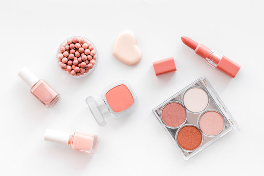 Makeup background with rounge, powder and tools on white table top view