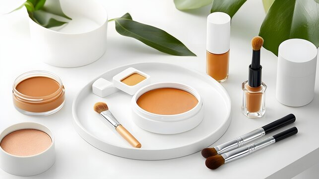 Cosmetic application techniques beauty studio product display minimalist environment overhead view enhancing makeup skills