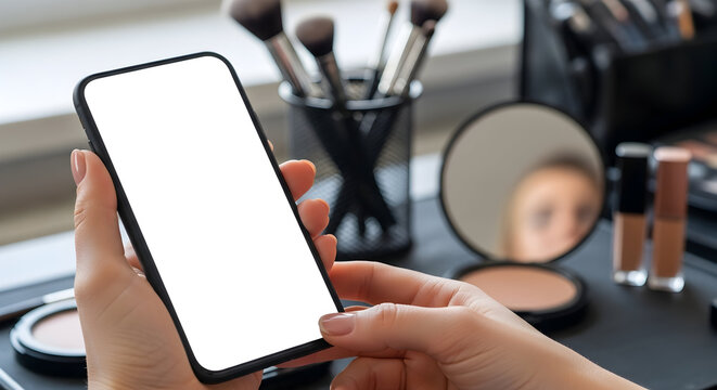Close-up of female hands holding smartphone recording video of beautician applying makeup on model face, creating content for social media or online tutorial. Concept of beauty treatment.
