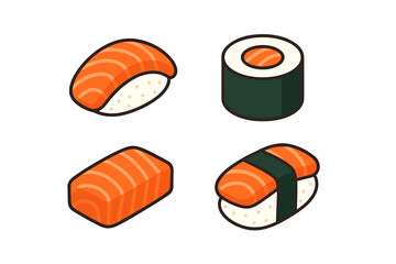 Salmon sushi and sashimi icon set. Isometric flat design vector illustration of Japanese food. Includes nigiri, maki roll. Seafood cuisine for restaurant menu or logo.