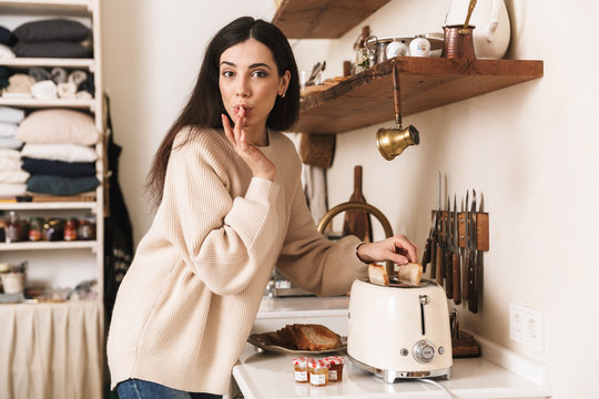 Picture of satisfied brunette woman 30s making breakfast with toasts at home