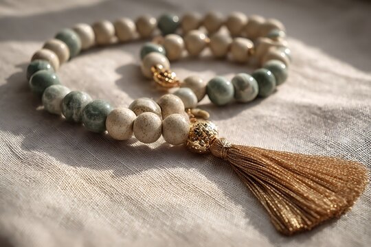 Elegant mala beads with natural stones and a luxurious gold tassel resting on textured fabric, evoking serenity and style.