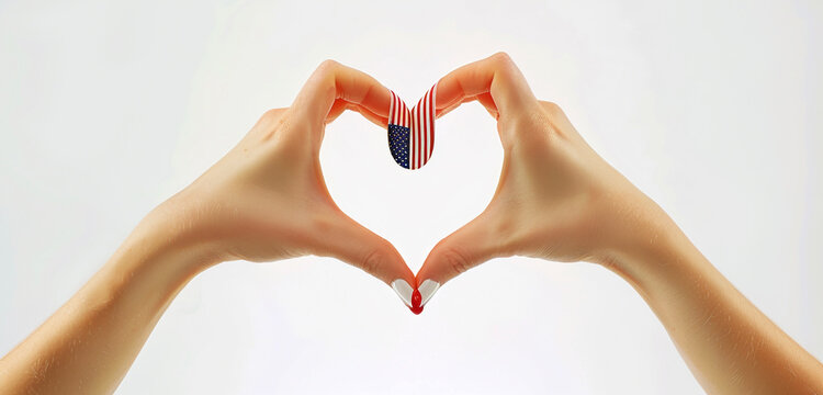 Vibrant American flag held in female hands forming a heart gesture, creating a minimal Memorial Day design with a clean white setting.