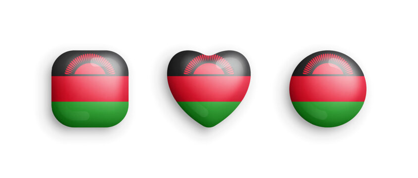 Malawi Official National Flag 3D Vector Glossy Icons In Rounded Square, Heart And Circle Form Isolated On White Back. Malawian Sign And Symbols Graphic Design Elements Volumetric Buttons Collection