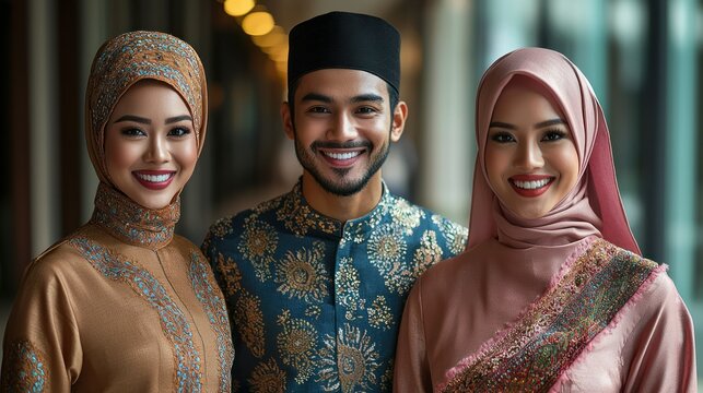 Elegant Malaysian Couple and Woman in Traditional Attire
