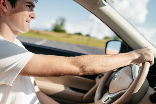 Side view young man driving car confident. Teenager driver enjoying the ride on the city street, keeps hands on the steering wheel looking focused at traffic