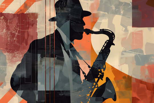 Afro-American male jazz musician saxophonist playing a saxophone in an abstract cubist style painting for a poster or flyer, stock illustration image