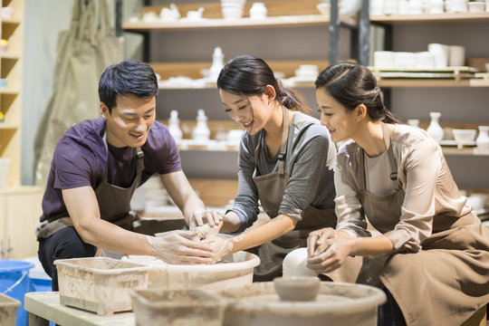 Portrait of craftsman working with clay in pottery workshop. Small business concept.