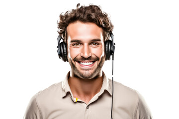 Young handsome male technical support agent trying to explain something to a client while using hands-free headset at call center