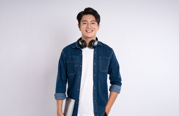Teen guy with books and backpack over background