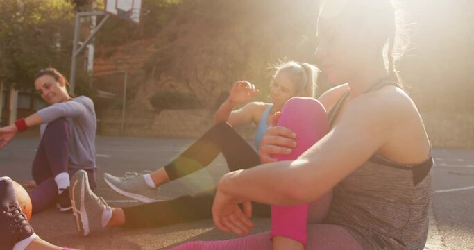 Diverse female basketball team wearing sportswear, stretching