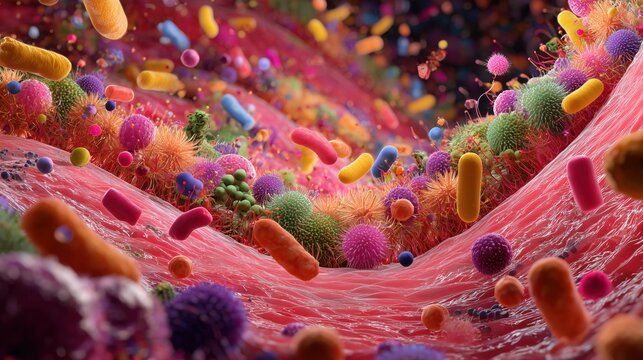 National Celiac Disease Awareness Day. Scientific visualization of gut microbiome in celiac disease, diverse microorganisms around intestinal lining, colorful but realistic