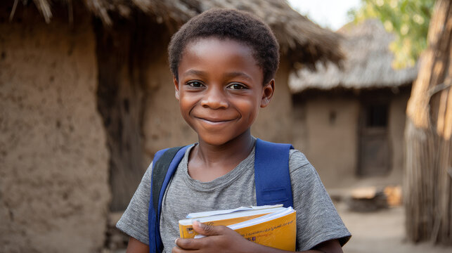 Happy little african boy with school bag holding and hugging his books near village adobe house. Black African children from disadvantaged families study in school, read books,
