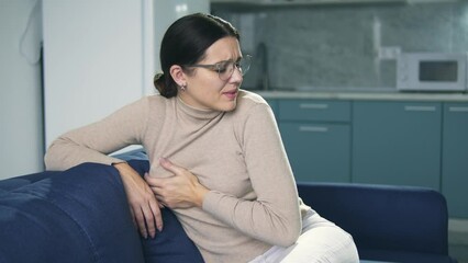 Unhappy brunette woman feeling pain in her breast, mammary gland inflammation