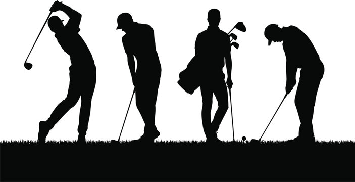 Vector Golf Swing Silhouette Scene Of Player Driving, Putting And Walking With Bag