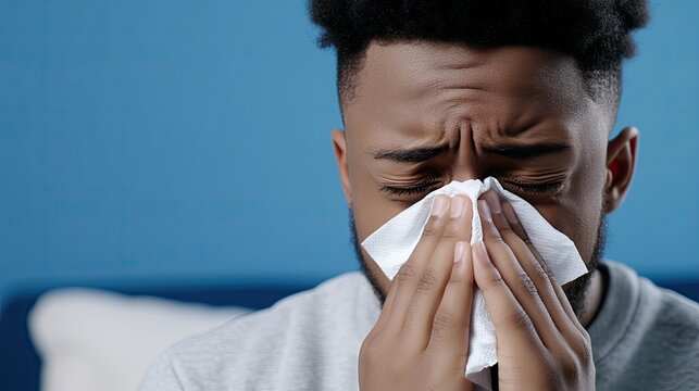 Young African American man at home blowing his nose into a handkerchief during a quiet moment of reflection in natural light