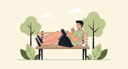 Young Man Enjoying Reading And Coffee On A Bench In The Park