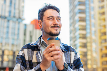 Happy Caucasian middle-aged man enjoying morning coffee hot drink and smiling outdoors. Relaxing, taking a break. Guy standing on urban city center street, drinking coffee to go. Town lifestyles.