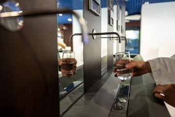 Unrecognizable man taking water enjoying his day off at luxurious wellness spa center.