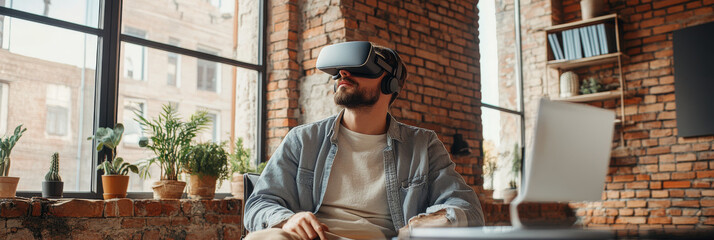 Immersed in virtual world, man wearing VR headset sits in stylish, modern room filled with plants and natural light. brick walls add cozy touch to tech savvy environment