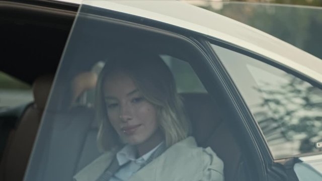 Smiling handsome man in suit opening a car door for happy pretty elegant blonde woman and helping her getting out of the car on airport parking outdoors