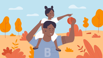 Happy father and daughter playing together in autumn city park vector illustration. Cartoon man character holding ball to play, girl child sitting on fathers shoulders, family fun time background