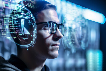Programming coding and man with focus, hologram and trading with cyber security, futuristic and research. Male person, investor and employee with data analysis, server or investment with website info