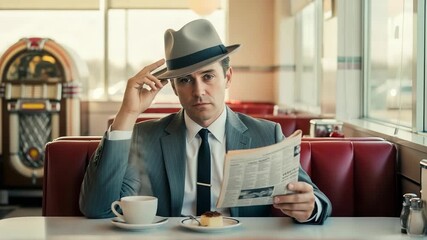 A Stylish Man in a Vintage Diner Reading a Newspaper and Sipping Coffee