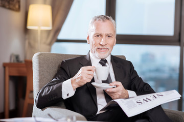 Coffee time. Vigorous energetic senior man reading newspaper while sipping coffee and sitting
