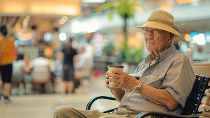 Elderly man in a hat sitting with a coffee cup in a bustling public area, possibly a mall or airport.