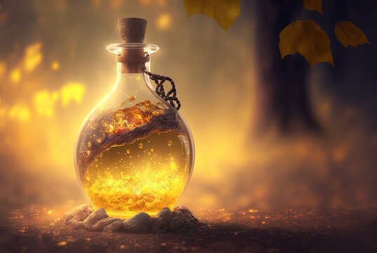 beautiful  special elixir drub potion in glass bottle, idea for videogame item in real life, fantasy light glow bokeh background, vitality potion