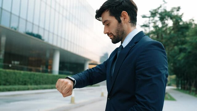 looking at luxury watch on hand check the time at workplace.concept for managing time organization working,punctuality,appointment.fashionable wearing stylish
