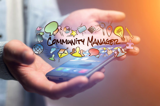 Concept of man holding smartphone with community manager title and multimedia icons flying around