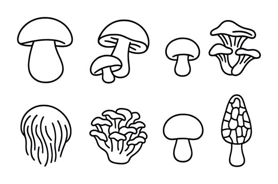 Wild Mushroom Icons. Outline icon set of wild mushroom varieties: porcini, shiitake, oyster mushroom, button