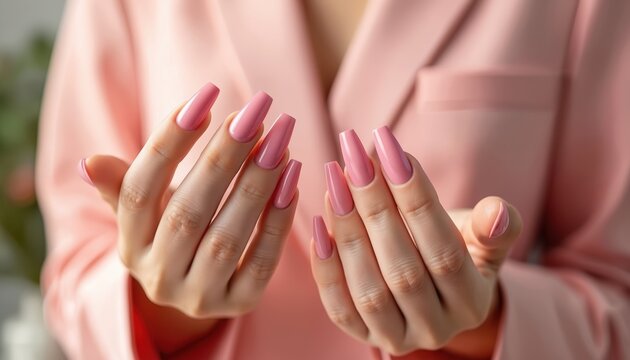 Female hands in gray knitted sweater with beautiful manicure - pink nude nails on pink background, wide panoramic banner with copy space. Nail care concept