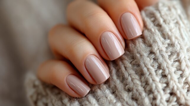 Elegance in Nude: An up-close studio shot of a hand with manicured nude nails rests delicately atop a textured knit sweater, creating an inviting interplay of textures and tones.