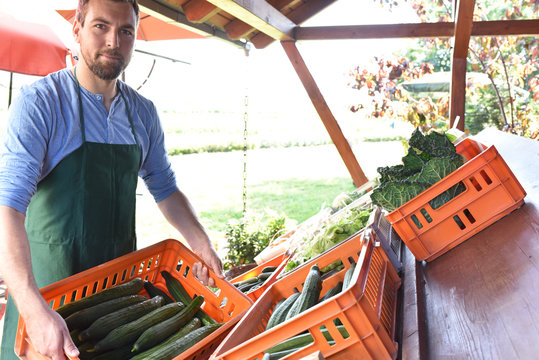 regionaler Gemüseanbau: Bauer mit Stiegen Gurken zum Verkauf auf dem Bauernhof
