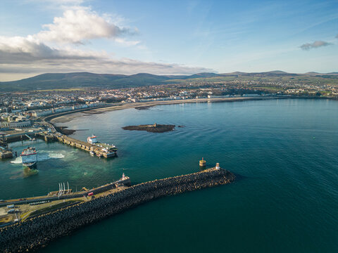 Douglas, Isle of Man - 25 March 2023: view of Douglas Bay with the entrance to Douglas South Quay Harbour, Isle of Man Sea Terminal, and Central Promenade