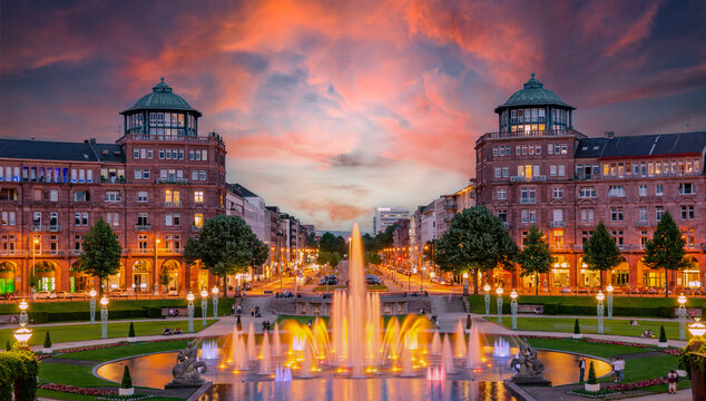 Mannheim, Germany. View on Friedrichsplatz at sunset with fountain creating splendid water and color effects. 2013-06-16.