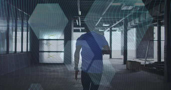 Digital composite video of hexagonal shapes against rear view of african american man running