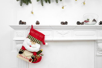 A close picture of beautifully decorated Santa Christmas socks with ho! ho! ho! word hanging on a fireplace waiting for presents.