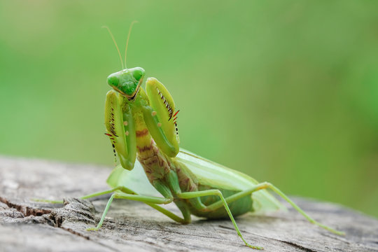 grasshopper, mantis in Defensive Stance on tree stump.