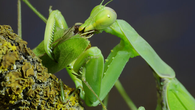 Sexual cannibalism, Close-up portrait of large female green praying mantis eats the male after mating on tree branch covered with lichen. Transcaucasian tree mantis (Hierodula transcaucasica)
