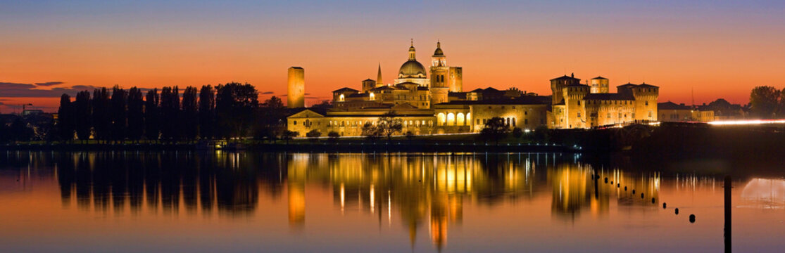Mantova, skyline del centro storico riflesso nel lago di Mezzo.