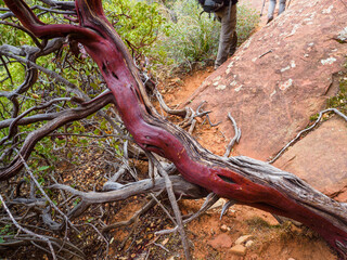 Manzanita flowers blooming in late March in Zion National Park Utah.  Gnarled branches show the smooth red bark characteristic of these bushes.