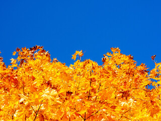 Closeup of Yellow Autumn Maple leave on tree branch against blue sky with copy space.