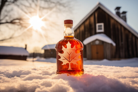 Morning light graces a maple syrup farm Steam rises from the sugar shack where metal sap buckets await, snow blankets the ground.
