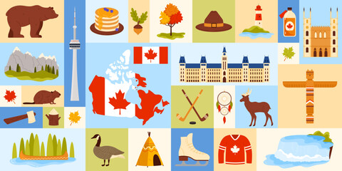 Vector illustration showcasing key Canadian cultural elements such as national landmarks, animals, and traditions. Highlights the rich heritage of Canada.