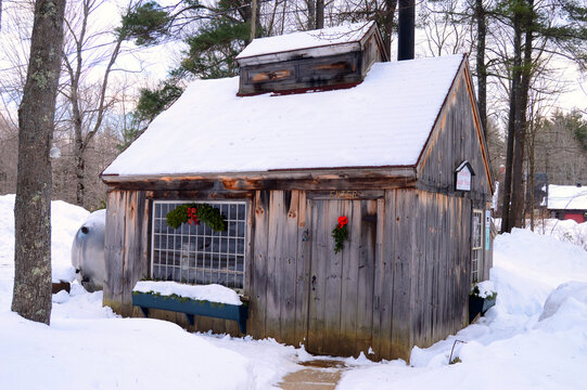 A small sugar shack, where pure maple syrup is made is decorated with a small Christmas wreath and surrounded by snow on a winter day