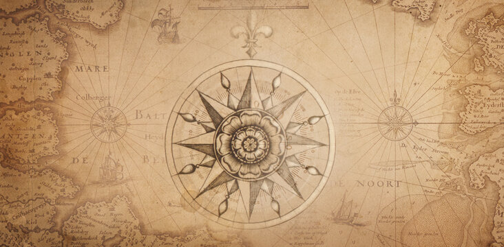 Old map collage background. A concept on the topic of sea voyages, discoveries, pirates, sailors, geography, travel and history. Effect of overlay on old texture of paper.